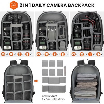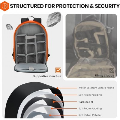 【Materiale di alta qualità】 Zaino DSLR realizzato in materiale poliestere qualificato, durevole e resistente all'acqua. La copertura antipioggia extra impermeabile e i divisori antiurto possono proteggere efficacemente la tua attrezzatura fotografica da bagnarsi o danneggiarsi.