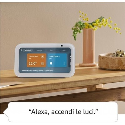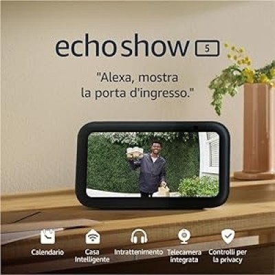 • ALEXA PUÒ MOSTRARTI MOLTE COSE: Echo Show 5 è dotato di uno schermo da 5,5", per controllare a colpo d’occhio il meteo e le ultime notizie, fare videochiamate, visualizzare le videocamere compatibili, ascoltare musica e programmi in streaming, e molto altro.