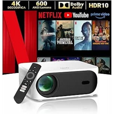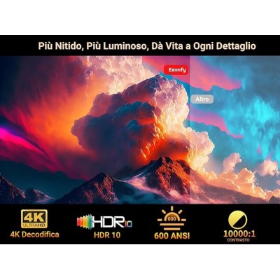 • 【HDR10 e Decodifica 4K】 Dotato della tecnologia HDR10, il proiettore 4K home cinema migliora il contrasto e la precisione dei colori, rendendo le scene luminose ancora più brillanti e quelle scure più profonde, ottenendo un eccezionale intervallo dinamico. Con una risoluzione nativa 1080P e 600 lumen ANSI, proiettore portatile offre chiarezza HD, mentre la decodifica 4K fornisce maggiori dettagli e nitidezza, ideale per film, giochi e un'esperienza visiva migliorata.