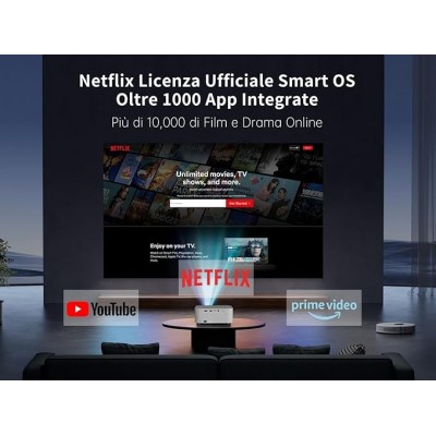 • 【Licenza Ufficiale Netflix】Proiettore video tv è dotato di un sistema operativo Smart integrato con app preinstallate, senza necessità di TV Stick, con un solo clic, puoi utilizzare le app ufficiali come Netflix/YouTube/PrimeVideo e altre applicazioni certificate. Proiettore portatile per home cinema offre un accesso rapido e diretto a più di 100.000 film e serie TV, garantendo un'esperienza di intrattenimento senza fine.